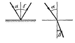 Отражение света. Наблюдения показывают, что в однородной среде свет распространяется прямолинейно. Прямая, указывающая направление распространения света, называется световым лучом. На границе раздела двух сред свет может частично отразиться и распространяться в первой среде по новому направлению, а также частично пройти через границу раздела и распространиться во второй среде. В большей или меньшей мере отражение света происходит от любых предметов, поэтому мы видим все освещенные тела. Закон отражения. Как показывают наблюдения, при отражении света всегда выполняется закон отражения: луч падающий, луч отраженный и перпендикуляр к границе раздела двух сред, восставленный в точке падения луча, лежат в одной плоскости; угол отражения g равен углу падения a (рис. 2).