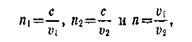 где с — скорость света в вакууме, u — скорость света в данной среде. Абсолютные показатели преломления всех веществ больше единицы. Это значит, что скорость распространения света в любом веществе меньше скорости распространения света в вакууме. Для двух сред с абсолютными показателями преломления п1 и n2 относительный показатель преломления п равен отношению абсолютного показателя преломления второй среды к абсолютному показателю преломления первой среды. Действительно, так как