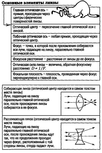 Из формулы линзы и последней формулы линейного увеличения Г или построением хода лучей можно установить, что для собирающей линзы при условии d > 2F действительное изображение получается уменьшенным (Г<1). В случае d = 2F линейные размеры действительного изображения равны размерам предмета (Г = 1). В случае F <d<2F изображение действительное, увеличенное (Г>1). При помещении предмета между фокусом и центром линзы (d<F) изображение получается увеличенное, мнимое. ГЛАВА II. ОПТИКА В ТАБЛИЦАХ И СХЕМАХ