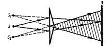 Рис.18 Если разность хода равна нечетному числу полуволн (а), то амплитуды А1, А2 имеют разные знаки, результирующая амплитуда А = 0 и происходит гашение волн. Если разность хода равна четному числу полуволн (б), то амплитуды А1, А2 имеют одинаковые знаки, А = А1 + А2 и происходит усиление света. Известно, что излучение светящегося тела складывается из волн, испускаемых отдельными атомами. Продолжительность излучения отдельного атома составляет 10-8 с. За это время в вакууме образуется цуг волн(последовательность горбов—впадин) протяженностью около 3 м, т. е. d = ct=3×10 8м/с10-8с = 3м Поскольку тело одновременно излучает большое количество атомов, возбуждаемые ими цуги волн, накладываясь друг на друга, претерпевают случайные скачкообразные изменения, т. е. они не являются когерентными и устойчивой картины интерференции не наблюдается. Для получения когерентных световых пучков применяют различные. искусственные приемы. Физическая сущность всех приборов (зеркала Френеля, бипризмы Френеля, щели Юнга и т. д.) для наблюдения интерференции света одна и та же: свет от одного источника идет к экрану двумя различными путями. Схема наблюдения интерференции света с помощью бипризмы Френеля изображена на рисунке 19. Бипризма Френеля состоит из двух одинаковых, сложенных основаниями призм с малыми преломляющими углами. Свет от источника S преломляется в обеих призмах, в результате чего за бипризмой распространяются световые лучи, как бы исходящие из мнимых источников S1 и S 2, являющихся когерентными. Таким образом, на поверхности экрана (в заштрихованной области) происходит наложение когерентных пучков и наблюдается интерференция.