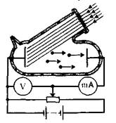 Если зарядить пластину положительно, то освещение пластины, например электрической дугой, не влияет на быстроту разрядки электрометра. Но если пластину зарядить отрицательно, то световой пучок от дуги разряжает электрометр очень быстро. Объяснить это можно единственным образом. Свет вырывает электроны с поверхности пластины. Если она заряжена отрицательно, электроны отталкиваются от нее и электрометр разряжается. При положительном же заряде пластины вырванные светом электроны притягиваются к пластине и снова оседают на ней. Поэтому заряд электрометра не изменяется. Однако, когда на пути света поставлено обыкновенное стекло, отрицательно заряженная пластина уже не теряет электроны, какова бы ни была интенсивность излучения. Поскольку известно, что стекло поглощает ультрафиолетовые лучи, то из этого опыта можно заключить, что именно ультрафиолетовый участок спектра вызывает фотоэффект. Этот сам по себе несложный факт нельзя объяснить на основе волновой теории света. Непонятно, почему световые волны малой частоты не могут вырывать электроны, если даже амплитуда волны велика и, следовательно, велика сила, действующая на электроны. Законы фотоэффекта. Для того чтобы получить о фотоэффекте более полное представление, нужно выяснить, от чего зависит число вырванных светом с поверхности вещества электронов (фотоэлектронов) и чем определяется их скорость или кинетическая энергия. С этой целью были проведены экспериментальные исследования, которые состояли в следующем. В стеклянный баллон, из которого выкачан воздух, помещаются два электрода (рис. 21). Внутрь баллона на один из электродов поступает свет через кварцевое «окошко», прозрачное не только для видимого света, но и для ультрафиолетового излучения. На электроды подается напряжение, которое можно менять с помощью потенциометра и измерять вольтметром. К освещаемому электроду присоединяют отрицательный полюс батареи. Под действием света этот электрод испускает электроны, которые при Движении в электрическом поле образуют электрический ток.