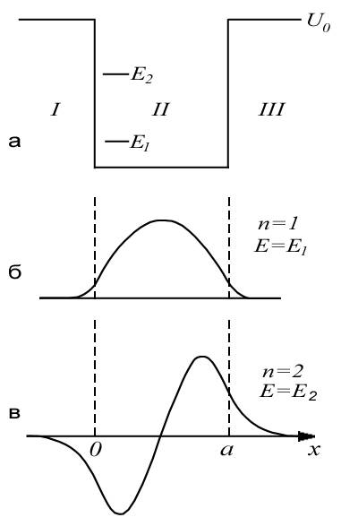 Рассмотрим частицу, находящуюся в области потенциальной прямоугольной ямы конечной глубины (рисунок 4). Такая модель качественно описывает движение заряженной частицы, например, электрона, вблизи атома и применяется в атомной физике и физике твердого тела. Пусть потенциальная энергия частицы имеет вид