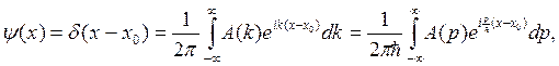 что означает возможность одновременного точного измерения координаты и импульса. Предельный переход h → 0 в квантовомеханических формулах называется переходом в квазиклассическое приближение. Отражением глубокой связи между физикой и математикой, как показал Э. Ферми, является возможность формального получения предельной формулировки принципа неопределенности из свойств интегрального преобразования Фурье, связывающего координатное пространство и обратное k -пространство (или, с учетом формулы р=ћk, импульсное пространство). Предположим, что частица имеет точно определенное значение координаты х=х 0. Тогда ее волновая функция, являющаяся собственной функцией оператора координаты с непрерывным собственным значением х0, т.е.