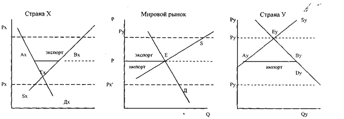В стране X рыночное равновесие достигается в точке Ех, где цена товара равна Рх. В стране Y рыночное равновесие достигнуто в точке Еу, где цена товара Ру. А так как Рх<Ру, то в стране X товар дешевле, чем в стране У. следовательно, стране X выгодно производить его больше и экспортировать в страну У и получить от этого прибыль, а стране У выгодно его импортировать из страны X и тем самым снизить затраты. В стране X при любой цене выше равновесной возникает избыточное предложение, а в стране У при любой цене ниже равновесной возникает избыточный спрос и страны договариваются о торговле данным товаром. Поскольку существуют только две страны, то количество товара, экспортируемого страной X должно быть равно количеству товара, импортированного страной У, или, что тоже самое, избыточное предложение в стране X должно быть равно избыточному спросу страны У. цена Рх служит нижней границей, при которой экспорт невозможен, но если она поднимется выше, то появится избыточное предложение. Цена Ру является максимальной ценой, при которой импорт не возможен, но если она снизится, то появится избыточный спрос. В этих границах, т.е. между Рх и Ру устанавливается точка равновесия, при которой избыточное предложение страны X (экспорт) равно избыточному спросу страны У (импорту), т.е. АхВх = АуВу. На графике мировой спрос и мировое предложение показаны кривыми DBS. возникает рыночное равновесие, но уже на мировом рынке, в т.Е при новой равновесной цене товара Р. Date: 2015-05-19; view: 831; Нарушение авторских прав |