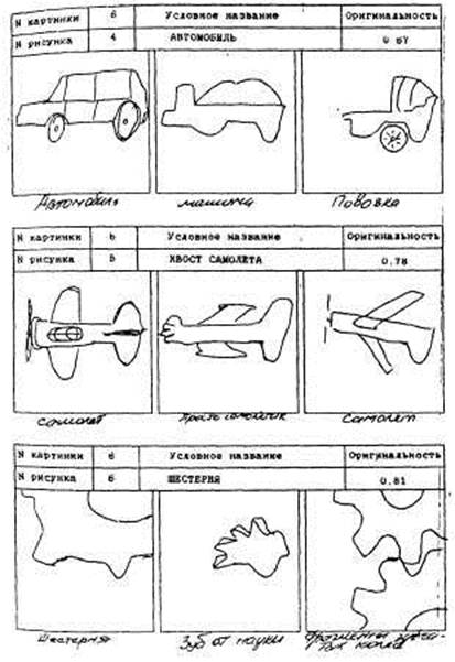 - 6 является при интерпретации результатов существенным и используется лишь для более ясного понимания рисунка. УСЛОВИЯ ПРОВЕДЕНИЯ. Тест может проводится как в индивидуальном, так и в групповом варианте. При проведении теста необходимо учитывать, что креативность проявляется в полной мере только в благоприятных условиях. Неблагоприятные функциональные состояния, сложные условия проведения, не достаточно доброжелательная атмосфера тестирования резко понижают результаты. Данное требование является общим при проведении тестирования любых форм креативности, поэтому перед тестированием креативности всегда пытаются создать благоприятную обстановку, минимизировать мотивацию достижения и сориентировать тестируемых на проявление своих скрытых способностей. При этом лучше избегать открытого обсуждения предметной направленности методики, т.е. не нужно сообщать о том, что тестируются творческие способности (особенно творческое мышление). Тест можно представить как методику на "оригинальность", возможность выразить себя в непривычном деле и т.д. Время тестирование по возможности не ограничивают, ориентировочно отводя на каждую картинку по 1-2 минуте. При этом необходимо подбадривать тестируемых, если они долго обдумывают или медлят. Предлагаемый вариант теста Торанса представляет собой набор картинок с некоторым набором элементов (линий), используя которые испытуемым необходимо дорисовать картинку — 7 — до некоторого осмысленного изображения. В данном варианте теста используется 6 картинок, выбранных из 10 оригинальных. Данные картинки не дублируют по своим исходным элементам друг друга и дают наиболее надежные результаты. В оригинальном тесте Торренса используется несколько показателей креативности. Наиболее показательный из них - оригинальность, непохожесть созданного испытуемым изображения на изображения других испытуемых. Другими словами оригинальность понимается как статистическая редкость ответа. Следует, однако, помнить, что двух идентичных изображений не бывает, и, соответственно, говорить следует о статистической редкости типа (или класса) рисунков. В прилагаемом ниже атласе приведены различные типы рисунков и их условные названия, предложенные автором адаптации, которые отражают некоторую существенную характеристику изображения. При этом важно, что условные названия рисунков как правило не совпадают с названиями рисунков, данными самими испытуемыми. В этом, на наш взгляд, достаточно ярко проявляется различия между вербальной и невербальной креативностью. Поскольку тест используется для диагностики невербальной креативности, то названия картинок, даваемые самими испытуемыми, из последующего анализа исключаются и используются только в качестве вспомогательного средства для понимания сути рисунка. Показатель "оригинальность" рисунка в нашем случае оценивался исходя из всего массива данных и подсчитывался по следующей формуле: