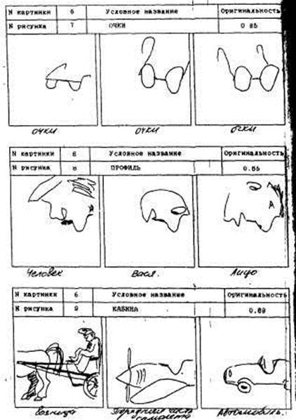 Полный тест Торренса (Torrance Test of Creative Thinking) представляет собой 12 субтестов, ' сгруппированных в три батареи. Первая предназначена для диагностики словесного творческого мышления, вторая - невербального творческого мышления (изобразительное творческое мышление) и третья - для словесно-звукового творческого мышления. Невербальная часть данного теста, известная как "Фигурная форма теста творческого мышления П.Торренса" (Flgural forms), была адаптирована в НИИ общей и педагогической психологии АПН 8 1990 году на выборке школьников. Нами была предпринята попытка адаптации одного из субтестов полного теста Торренса - субтеста "Завершения картинок" (Complete Figures) - на выборке менеджеров в возрасте от 23 до 35 лет. Тест адаптирован в 1993-94 годах в лаборатории диагностики способностей и ПВК Института психологии Российской академии наук. При адаптации особый акцент ставился на выявление невербальной креативности, как некоторой способности к "порождению" нового, оригинального продукта в условиях минимальной вербализации. Другими словами - вербализация материала, с которым работает испытуеяий, и средств "порождения" нового продукта не обязательна и вторична. Обозначение испытуемым нарисованного некоторыми словами не