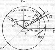 Направление луча, падающего на поверхность, удобно задать при помощи сферических уголов φ и θ. При этом телесный угол dΩ можно выразить через угол θ и приращения углов dφ и dθ. Для этого построим сферу произвольного радиуса R (рис. 16.5).