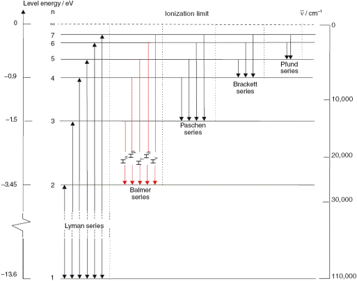 Подстановка в эту формулу известных значений фундаментальных постоянных приводит к значению R, которое с высокой точностью соответствует экспериментальному значению постоянной Ридберга. Согласно формуле (18.13) энергия электрона тем больше, чем больше квантовое число п. Значения энергии электрона в атоме отмечают отрезками прямых линий на числовой оси Е (рис. 18.7). Эти отрезки называют уровнями энергии электрона.