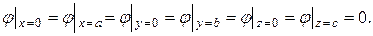 Рассмотрим в рамках квантовой механики движение частицы, заключенной в некотором ограниченном объеме V. Пусть этот объем имеет форму прямоугольного параллелепипеда (рис. 20.11). Построим прямоугольную декартову систему координат так, чтобы плоскости, ограничивающие движение частицы, имели уравнения: х = 0, х = а, у = 0, у = b, z = 0 и z= с, где а, b и с - длины ребер параллелепипеда. Если частица испытывает воздействие только со стороны стенок "ящика" при ударах о них, а внутри него движется свободно, то зависимость Ее потенциальной энергии от координат можно описать формулой