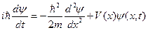 Вероятность прохождения потока частиц через «потенциальную ступеньку» в зависимости от энергии частицы (пунктир – классический результат) Как видно, существенное отличие результатов наблюдается лишь в достаточно узком интервале энергий частицы вблизи V0. Рассмотренная нами стационарная картина процесса неадекватна постановке задачи о движении классической частицы (материальной точки) в поле «потенциальной ступеньки». Действительно, использованное выше представление о потоке частиц с заданной энергией с математической точки зрения означает задание волновой функции в виде плоской волны, т.е. исключает вопрос о локализации частицы в какой-либо области пространства. В результате за рамками рассмотрения остается вопрос о пространственно-временной картине движения частицы в потенциальном поле. Изучение такой картины процесса желательно как с точки зрения прямого сопоставления классического и квантового решения рассматриваемой задачи, так и в связи с невозможностью в рамках традиционного стационарного подхода дать ответ на ряд вопросов, возникающих при изучении явления. Например, было бы интересно увидеть, где локализована частица в «момент» (в процессе) рассеяния и какова длительность этого процесса, как при этом изменяется ее скорость движения, каковы скорость прошедших и отраженных частиц, где и с какой вероятностью мы обнаружим частицу в конкретный момент времени. Ответ на эти вопросы может дать только решение нестационарного уравнения Шредингера. Математическая постановка задачи заключается в следующем: мы должны решить уравнение: