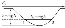 Согласно классической физике, финитное движение частицы происходит в ограниченной области пространства — потенциальной яме, определяемой физической природой взаимодействия частиц. Иными словами, потенциальная яма есть область, в которой на частицу действует сила, удерживающая ее в этой области. Термин «потенциальная яма» происходит от вида графика, изображающего зависимость потенциальной энергии частицы от координат, и применяется как в классической, так и в квантовой теории. Основное свойство потенциальной ямы — удерживать частицу, кинетическая энергия которой меньше глубины ямы; такая частица внутри потенциальной ямы будет находиться в связанном состоянии. Связанное состояние — это состояние системы частиц, при котором их относительное движение происходит в ограниченной области пространства (т. е. является финитным) в течение длительного времени по сравнению с характерными для данной системы периодами. В природе существует огромное число связанных систем: от звездных скоплений и макроскопических тел до микрообъектов — молекул, атомов, ядер. В классической механике частица с энергией, меньшей глубины потенциальной ямы, попав в нее, не сможет выйти и будет двигаться внутри ямы; положение частицы на дне ямы отвечает устойчивому равновесию и соответствует нулевой кинетической энергии. Если же энергия частицы превышает глубину потенциальной ямы, то она преодолевает действие сил притяжения и свободно покидает яму. Примером может служить движение упругого шарика, находящегося в поле сил земного притяжения, в обычной яме с жесткими стенками (рис. 5.1). Шарик массы m с энергией Е1 < U не может покинуть потенциальную яму глубиной U = mgН, где - g — ускорение силы тяжести, а Н — высота ямы (обычной), в которую попал шарик, и будет совершать колебания между точками 1 и 2 (если пренебречь трением), поднимаясь лишь до высоты