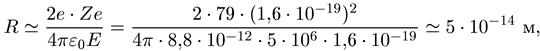 Из опытов Гейгера и Марсдена легко оценить верхний предел размера ядра. В эксперименте использовались а-частицы с энергией Е = 5 МэВ. Это значит, что если считать поле чисто кулоновским, то минимальное расстояние, на которое подходили а-частицы к ядрам золота (Z = 79), равно (системе СИ)