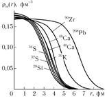 где ρ(r) — радиальная плотность нуклонов, усредненная по углам и нормированная на единицу. Часто под радиусом ядра понимается радиус R3 эквивалентного шара с однородной плотностью. Сведения о распределении нуклонов извлекают из экспериментов по взаимодействию ядер с пробными телами. В зависимости от того, изучается ли распределение электрического заряда в ядре или ядерного вещества, все мез тоды измерения можно разделить на две группы: электромагнитные и ядерные. В первой группе в качестве пробных частиц используют электроны, позитроны, мюоны — частицы, взаимодействие которых с ядрами имеет электромагнитную природу и которые не участвуют в ядерном взаимодействии (см. ниже). При этом исследуется либо характер рассеяния частиц на яДРе? либо их состояние, связанное с ядром (сдвиги уровней мезоатомов, сверхтонкое расщепление и т. п.). С помощью ядерных методов исследуют упругое рассеяние и ядерные реакции, вызываемые ядерноактивными частицами.
