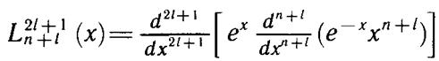 Оно может быть сведено к известному в математике уравнению Лагерра, а решение его—полиномы Лагерра L2n+1n+l (x)— определяется сравнительно простой в использовании для вычислений полнномообразующей формулой (11.9), приведенной выше. Понятно, что они с точностью до постоянного множителя совпадают с ранее рассмотренным Llnr. (Множитель значения для нас не имеет, так как функции будут нормироваться.) Для получения окончательного результата — решения радиального уравнения — надо перейти к первоначальной переменной r с помощью использованных подстановок: