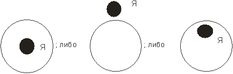 Данная графическая методика может иметь разнообразие в схематическом вычерчивании: рисуется геометрическая фигура и по отношению к ней располагается «Я» респондента. Например, если коллектив обозначить кругом, то позиции «Я» могут иметь варианты, представленные на рис. 3. Этим же графическим способом можно предложить детям обозначить свое отношение к учебным предметам (определить «Я» по отношению к окружностям с надписями «литература», «география», «математика» и т. д.). Дистанционное расположение выявит учебно-познавательные интересы школьников. (Кукушин В.С. Теория и методика воспитательной работы: учеб. пособие. – Ростов-на-Дону, 2002. – С. 286; Щуркова Н.Е. Классное руководство: рабочие диагностики. – М.: Педагогическое общество России, 2001. – С. 44.)