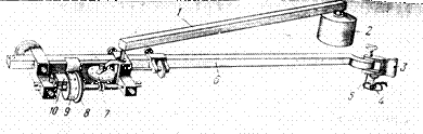Полярный планиметр состоит из полюсного 1 и обводного 6 рычагов, соединяемых во время работы шарниром. На конце рычага 1 находится полюс 2 с иглой. На одном конце обводного рычага расположен счетный механизм, а на другом - обводное устройство.
