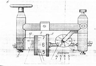 Удерживая планиметр за ручку 3, обводят специальным устройством 4 (увеличительное стекло с точкой в центре) контур участка, площадь которого хотят измерить (рисунок 8). Счетный механизм состоит из счетного колеса 9, имеющего 100 делений, верньера 10 с десятью делениями. Отсчеты выражаются четырехзначным числом (рисунок 11). 1-ая цифра - с циферблата 7 по указателю (считывается младшая) 2-я цифра - число на счетном колесе 9, подписанное до нулевого штриха верньера 3-я цифра – число целых делений между второй цифрой отсчета и нулевым штрихом делений. 4-я цифра берется с верньера по совпадающему штриху.
