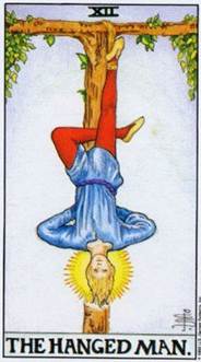 Казалось бы, всё понятно, нужно устремляться к сияющим, светлым вершинам… Но почему же так часто мы упираемся в непреодолимую преграду, некий потолок, не дающий дальнейшего роста. Здесь две причины. Одна из них, что низшее и высшее тесно связаны, а вторая, что мы уходим от своего подножья Древа Жизни далеко в сторону. Это как бы нырнуть в прорубь ледяной реки, а затем отплыть далеко от неё и попытаться вынырнуть. С чем мы встретимся?….понятно, с чем, с ледяным потолком. Но эту, вторую причину, пока отставим и посмотрим на первую, связанную с ожидаемым направлением духовного продвижения. Посмотрите на эту карту БА Таро, называемую мною «Посвящённый», более соответствующую её сути и чтобы удалить негативную программу от названия «Повешенный», как в колоде Таро.
