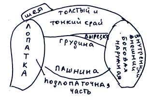 Задняя часть ноги делится на внутреннюю, внешнюю, боковую, наружную. Отличить другую часть от вырезки: нужно её разрезать и увидеть, что в вырезке однородная масса (только мышечная часть, соединительная часть отсутствует). Вырезка в плёнке, аккуратная. Ростбиф. (готовят из вырезки или битка). Бывает с кровью. Запекают в сильно разогретой духовке целиком.