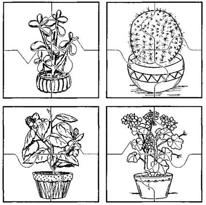 Коррекционно-образовательные цели. Уточнение и расширение словаря по теме. Совершенствование грамматического строя речи (употребление предложно-падежных конструкций). Коррекционно-развивающие цели. Развитие диалогической речи, силы голоса, тонкой, артикуляционной и общей моторики, слухового внимания, фонематических представлений. Коррекционно-воспитательные цели. Формирование навыков сотрудничества, ответственного отношения к выполнению заданий. Воспитание доброжелательности, желания быть справедливыми, бережного отношения и любви к природе. Оборудование. Тетрадь №1 по числу детей, контейнер с цветными карандашами, предметные картинки с изображениями комнатных растений, маленький пластиковый горшочек с фиалкой, пазлы с изображениями комнатных растений, мячи средней величины, цветные фишки, игрушки для сопровождения артикуляционной гимнастики, наклейки для награждения детей. Предварительная работа. Проведение опыта по разведению комнатных растений разными способами (черенком, листом, «деткой»). Ход занятия 1. Организационный момент. [Развитие речевого слуха.] Логопед приглашает детей в кабинет, предлагает занять места около стульчиков, организует приветствие. Логопед. Сначала сядут девочки, потом — мальчики. 2. Пазлы «Комнатные растения». [Развитие зрительного гнозиса и конструктивного праксиса.] Логопед раздает детям пазлы, предлагает рассмотреть и нашить растения, изображенные на них (рис. 16). Дети называют растения. Логопед. А теперь «сломайте» картинки, перемешайте пазлы и снова сложите изображения. Дети выполняют задание.