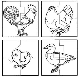Коррекционно-образовательные цели. Обучение составлению рассказа по картине. Обеспечение целостного восприятия картины. Развитие речевой активности. Продолжение уточнения и расширения словаря по теме. Коррекционно-развивающие цели. Развитие связной речи, уточнение словаря по теме, развитие мышления, зрительного внимания, творческого воображения, тонкой, артикуляционной и общей моторики, развитие зрительного гнозиса и конструктивного праксиса. Коррекционно-воспитательные цели. Формирование навыков сотрудничества, чувства ответственности, инициативности. Воспитание заботливого отношения к домашним животным. Оборудование. Картина «Птичий двор»[18], пазлы «Домашние птицы», картинки и игрушки для сопровождения выполнения артикуляционной гимнастики. Предварительная работа. Чтение русской народной сказки «Курочка Ряба», сказки В. Сутеева «Цыпленок и утенок», заучивание четверостиший из книжки-раскраски «Домашние птицы»[19]. Ход занятия 1. Организационный момент. [Объявление темы занятия, чтение детьми четверостиший из книжки-раскраски «Домашние птицы».] Логопед помещает на мольберт картину «Птичий двор» и предлагает детям рассмотреть ее внимательно. Объясняет, что сегодня на занятии они будут составлять рассказ по картине. Затем логопед предлагает детям рассказать стихи о домашних птицах. Петя, Петя, петушок, Борода и гребешок. На сапожниках пара шпор. Яркий сам, как светофор. Ути-ути-утки, Уточки-малютки На волнах качались, Брызгались, плескались. Мама-курица цыплят На прогулку водит в сад, Учит землю клювом рыть, Учит бабочек ловить. Серый селезень в реке От утят невдалеке. Очень селезень красивый, Шея сизая с отливом. 2. Рассматривание картины «Птичий двор» и беседа по ней. Логопед раздает детям наклейки или игрушки за то, что они так старались, рассказывая стихи. Логопед. Посмотрите на картину. Вы видите птичий двор, где гуляют домашние птицы. В пруду плавает утка с утятами. Утка большая, серая, хвост и крылья у нее темные, а клюв желтый. (Можно предложить повторить это описание одному из детей.) А какие утята? Расскажите про них. Какие они по размеру? Какого они цвета? Какие у них клювики, хвостики? 1-й ребенок. Утята маленькие, желтенькие. У них коротенькие хвостики и беленькие клювы. Логопед. Что делают утка и утята? 2-й ребенок. Утка учит утенка плавать, а утенок смотрит на нее. Логопед. Два утенка в стороне. Один плывет, а другой нырнул. У самой воды стоит селезень. Перышки на голове и шее у него зеленые. Он наблюдает за утятами. Над селезнем летают стрекозы, а одна стрекоза вьется над самой водой. (Это описание вновь повторяет один из детей.) Расскажите, какие птицы гуляют на берегу? 3-й ребенок. На берегу гуляют петушок, курочка и цыплята. Логопед. Петух большой, разноцветный. У него красивый хвост, красные борода и гребешок. А какая курочка? 4-й ребенок. Курочка поменьше петушка. Она коричневая, хвостик у нее небольшой. У нее тоже есть красные бородка и гребешок. Логопед. Что делают петушок и курочка? 1-й ребенок. Они идут и смотрят на своих цыплят. Логопед. Расскажите про цыплят. Какие они? Что они делают? 2-й ребенок. Цыплята желтенькие, у них острые клювики и маленькие крылышки. 3-й ребенок. Два цыпленка ищут в травке корм, а один бежит за петушком. 4-й ребенок. Самый смелый цыпленок взлетел ему на спину. Логопед. Каких птиц вы видите вдалеке у 