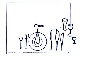 Рыбная вилка – с выемкой; нож – со щербинкой. Бокалы – для воды, соков, ставим рядом с кончиком ножа для вторых блюд (бокал для воды выше, чем для шампанского). Бокалы ставим по росту, по нарастающей от себя. В первую очередь ставим специи и хлеб. Блюда с кушаньем ставим так часто, чтобы человеку удобно было доставать самому. Сначала ставим большие блюда (тарелки) – рыбное, мясное, овощное ассорти. Спиртное ставим островком. На 1 стол можно ставить фрукты. Салаты, мясные ассорти, холодные закуски, затем горячие закуски (жульены, фаршированные грибы), все блюда без гарнира (фаршированная курица, рыба орли). Вторые блюда нельзя выносить слишком поздно.