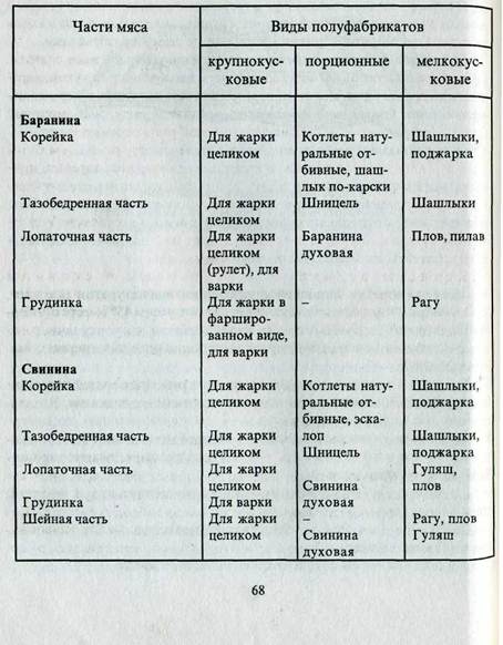 Крупнокусковые полуфабрикаты. Для блюда "баранина (с в и -Н и н а) жареная" используют большие куски мяса массой 1,5—2 кг ЛЗ корейки, тазобедренной части, лопаточной части (у свиной туши—из шейной части). Лопаточную часть предварительно свертывают рулетом и реревязывают шпагатом. Грудинка фаршированная — у грудинки со стороны пашины прорезают пленки между наружным слоем мякоти и мякотью на реберных костях так, чтобы образовался глубокий "карман". Образовавшийся "карман" заполняют фаршем, разрез закрепляют шпажкой или зашивают. С внутренней стороны грудинки надрезают пленки вдоль реберных костей, чтобы удалить кости после тепловой обработки. Для фарша используют гречневую или рисовую кашу, мясо с рисом. Гречневую (или рисовую) кашу соединяют с пассерованным луком, вареным рубленым яйцом, молотым перцем, зеленью петрушки и хорошо перемешивают. Сырое мясо измельчают, добавляют воду, соль, молотый перец, пассерованный репчатый лук, отварной рис и перемешивают. Порционные полуфабрикаты. Котлеты натуральные из баранины и свинины нарезают из половины корейки, примыкающей к почечной части, с 13-го до 6-го ребра. Для нарезки корейку кладут на стол ребрами вверх и, начиная от почечной части, нарезают под углом 45° порционные куски вместе с реберной косточкой. У нарезанных кусков вдоль ребра подрезают мякоть на 2—3 см, косточку зачищают, котлеты отбивают и надрезают сухожилия. Котлеты отбивные из баранины и свинины нарезают из корейки, оставшейся после нарезания натуральных котлет, с 6-го ребра. Порционные куски нарезают под углом 45° вместе с реберной косточкой. Подрезают мякоть вдоль косточки, косточку зачищают, мякоть отбивают, надрезают сухожилия, посыпают солью и перцем, смачивают в льезоне и панируют. Эскалоп — нарезают из корейки без реберных костей порционные куски толщиной 1,5—2 см, отбивают, надрезают сухожилия. Используют по 1—2 куска на порцию. Шашлык по-карски — нарезают из почечной части корейки по одному куску на порцию и маринуют. Для маринования нарезанное мясо кладут в неокисляющуюся посуду, сбрызгивают лимонным соком или уксусом, кладут мелко измельченный репчатый лук, молотый перец, соль, зелень петрушки и укропа (можно добавить растительное Масло), все перемешивают и ставят в холодильник на 4—5 ч. Почки маринуют вместе с мясом. Перед жаркой на шпажку вначале надевают половинку почки, затем мясо и вторую половинку почки. Шницель отбивной — нарезают из мякоти тазобедренной части порционные куски толщиной 1,5—2 см. Мякоть отбивают, надрезают сухожилия, посыпают солью, перцем, смачивают в льезоне, панируют в сухарях и придают соответствующую форму. Духовая баранина, свинина — нарезают из лопаточной части (у свиной туши — из шейной части) порционные куски под углом 45°, толщиной 2—2,5 см. Мелкокусковые полуфабрикаты. Шашлык по-кавказски — нарезают из мякоти корейки и тазобедренной части кусочки в виде кубиков массой 30—40 г и маринуют. Перед жаркой надевают на шпажку по 5—6 кусочков. Рагу — нарубают из грудинки баранины или свинины кусочки вместе с косточкой в виде кубиков массой 30—40 г по 3—4 кусочка на порцию. Плов — нарезают из лопаточной части, грудинки кусочки в виде кубиков массой 15—20 г по 6—8 кусочков на порцию. Гуляш — нарезают из лопаточной и шейной частей свинины кусочки в виде кубиков массой 20—30 г с содержанием жира не 