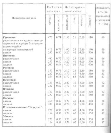 Из круп приготавливают различные блюда и гарниры, имеющие большое значение в питании человека. Разнообразные каши, запеканки, крупеники, пудинги, котлеты и биточки, приготовленные из гречневой, рисовой, манной, овсяной и других круп, содержат значительное количество углеводов в виде крахмала (72—90%) и клетчатки, белки (12—16%), особенно в полтавской и овсяной крупе, жир (до 8%), минеральные вещества (калий, фосфор, железо, магний, марганец), витамины гр. В, РР и Е (особенно в гречневой и овсяной крупе). Блюда из круп высоко калорийны. Их широко используют в питании детей и людей с большой физической нагрузкой. Блюда хорошо сочетаются с молочными продуктами. Калорийность каш и блюд из них от 300 до 450 ккал. Бобовые содержат вдвое больше белка, чем крупы (чечевица до 29%, фасоль до 31%, горох до 34%), хорошо растворимого в воде и легко усваивающегося организмом. В них много крахмала (60—70%), жира (6— 20%), минеральных веществ (калия, натрия, фосфора, железа), а также витамины B1, B2, РР, каротин. Благоприятное соотношение натрия и калия в фасоле способствует выведению из организма жидкости, улучшает работу сердечно—сосудистой системы. Макаронные изделия, изготовленные из муки высокого качества, содержащей много клейковины, ценят за имеющиеся в них белки (12—14%), крахмал (75—80%) и высокую калорийность. При тепловой обработке крупы, бобовые и макаронные изделия размягчают структуру тканей, изменяют свою консистенцию и массу. Они поглощают воду, т.к. клейстеризуется крахмал. Количество поглощенной жидкости зависит от содержаний водорастворимых веществ. Белки при варке поглощают воду, которую выделяют после денатурирования (свертывания) при 50—70°С. Жидкость идет на клейстеризацию крахмала. Крахмал состоит из двух полисахаридов — амилозы и амилопектина, который образует в горячей воде вязкие структуры. Крахмал клейстеризуется при 60—80°С. При более высокой температуре происходит распад крахмальных зерен, уменьшение вязкости, чему способствует и более длительное нагревание. При остывании и хранении клейстеров происходит их старение. Поваренная соль и сахар повышает температуру клейстеризации и понижает процесс разрушений крахмальных зеренсодержание клеточных стенок в виде гемицеллюлозы в крупах составляет 1,5—5%, они более устойчивы. Но во время тепловой обработки они разрушаются, зерна разрыхляются. Витамины гр.В при тепловой обработке частично разрушаются, растворимые вещества переходят в отвар, который можно использовать при приготовлении блюд. В готовом виде каши, бобовые и макаронные изделия используют как самостоятельные блюда и гарниры к блюдам из рыбы, мяса и птицы. § 1. ПОДГОТОВКА КРУП К ВАРКЕ Крупы перебирают, отделяя примеси и необрушенные зерна, промывают. Мелкие и дробленые крупы просеивают для удаления мучели, которая придает изделиям горьковатый привкус и мажущую консистенцию. Пшенную, рисовую и перловую крупу промывают теплой и горячей водой (1:2,1:3), остальную — теплой, меняют воду до трех раз. Дробленые и плющеные крупы не промывают, т.к. ухудшается вкус и консистенция каши. После промывки в крупах остается 10—30% воды. Сырую гречневую крупу поджаривают при температуре 110—120°С. При этом увеличивается количество водорастворимых веществ и ускоряется срок варки. В настоящее время вырабатываются быстроразваривающиеся крупы (подвергнутые гидр