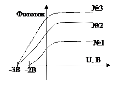 3. Пример: На фотокатоде в опытах №№ 1, 2 и 3 получили вольтамперные характеристики (см.рис.).