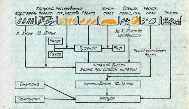 Если борщ слабо окрашен, в него добавляют краску. Для ее приготовления используют промытые свекольные очистки или свеклу, нарезанную тонкими пластинками. Свеклу заливают горячим бульоном или водой в соотношении 1:2, добавляют уксус (30 г на 1 л) и доводят до кипения. Затем свекольный отвар снимают с огня и настаивают. После процеживания используют для подкраски. Вводят в конце варки борща, не кипятят. Борщ московский. Его готовят на мясном бульоне, в котором отваривают ветчинные кости или копченую свиную грудинку. Готовят борщевую заправку. В процеженный бульон закладывают капусту, а после ее закипания — борщевую заправку. За 5...10 мин до окончания варки положить специи. Нарезанные мясо, ветчину, сосиски прогревают в бульоне, кладут в тарелку, заливают борщом. При подаче добавляют сметану и зелень. Отдельно можно подать ватрушки с творогом. Борщ украинский (рис. 16). В кипящий бульон засыпают капусту, через 5 мин — картофель, еще через 5... 10 мин — тушеную свеклу и. пассерованные коренья. Можно добавить сладкий перец. Муку прогревают без жира, охлаждают до 50° С, разводят холодным бульоном и процеживают. В конце варки вливают в борщ, дают прокипеть 5 мин, вводят растертый с салом чеснок и проваривают Рис 16 Схема приготовления борща украинского