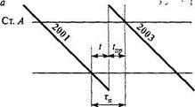_ 'пол Пр ~ Т При обращении на линии длинносоставных и сдвоенных поездов движение их надо организовать так, чтобы первым на раздельный пункт прибывал поезд одинарной длины, а тяжеловесный или длинносоставный пропускался вторым без остановки. При невозможности организовать движение по указанной схеме длинно-составные поезда принимаются с остановкой на раздельном пункте с занятием входной или выходной горловины. Чтобы безопасно пропустить встречный поезд необходимо длинносоставный или сдвоенный поезд разъединить на части с занятием двух приемо-отправочных путей. На выполнение операций по закреплению хвостовой части поезда (при занятии выходной горловины) разъединение и перестановку головной части затрачивается время, которое обязательно должно быть включено в общую продолжительность интервала неодновременного прибытия. В конкретных условиях при расчетах следует руководствоваться официальным изданием Инструкции МПС России по определению станционных и межпоездных интервалов. Станционный интервал скрещения > *- '" Станционным интервалом скрещения называется минимальное время от момента прибытия или проследования поезда через раздельный пункт до момента отправления на тот же перегон поезда встречного направления.