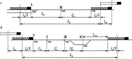 Рис. 5.20. Схемы расположения поездов, следующих в пакете при автоблокировке: а, б— разграничение поездов тремя и двумя блок-участками; в — разграничение поездов при приеме на станцию; г — разграничение поездов при отправлении на станции; д - разграничение поездов при безостановочном пропуске через станцию; К, Ж, 3 — красный, желтый и зеленый огни светофоров применяют схему разграничения поездов двумя блок-участками. Это движение называется ездой под зеленый на желтый (см. рис. 5.20, б). Расчетное расстояние Хр, м, между центрами поездов расчетной пары равно т =п 5 ■ I" + / + I' + I" +0 5-/' (5 23) х'р и>~^ 'п 'в бл 'бл и>-^ 'п> \~>.^о) где /в - расстояние, которое проходит второй поезд за время (в> необходимое для восприятия машинистом сигнала ближнего светофора, м. Тогда /= Ср 16,7 1- (5.24) где ( - время на восприятие сигнала машинистом, мин. Расположение поездов при прибытии, отправлении и безостановочном пропуске через станцию показано на рис. 5.20 (в, г, д). На схеме 10П означает расстояние, которое поезд проходит за время на выполнение части технологических операций по приему или отправлению поездов. Расчетный интервал при приеме поездов на станцию с остановкой включает в себя время на операции контроля прибытия первого поезда, приготовления маршрута приема второму поезду, открытия входного сигнала и на проход вторым поездом двух блок-участков: Г= /д Кср • 16,7 / (5.25) где 10П - время на выполнение части операций по прибытию поезда. При отправлении попутных поездов со станции интервал между ними г= /„ 16,7 , (5.26) где I - время на выполнение части операций по отправлению поезда. Аналитическим способом по приведенным формулам пользуются только для предварительных расчетов. С целью получения точных значений интервалов при разных схемах следования поездов применяется графический способ на основании тяговых расчетов с построением кривой линии хода поездов. Тяговыми расчетами с точностью до 0,1 мин определяются времена хода поездов по каждому блок-участку, а также: ■ время /н, мин, прохода центром второго поезда расчетной пары при от ■ время 1К, мин, от момента прохода центром первого поезда расчетной па ■ время (х, мин, от момента прохода центром первого поезда входного сигна При одинаковой скорости движения поездов расчетной пары интервалы определяются с учетом режимов: • при отправлении с начальной станции — разгон; ■ при следовании по участку — без остановок; ■ при подходе к конечной станции — замедление. Аналитически расчет интервалов /выполняют по следующим формулам: ■ первый интервал /, при отправлении с начальной станции с двухблочным 'I 'н 'бл.1 ^ 'бл.2 ^ 'бл.З / ' 'бл.З ■ второй интервал следования с двухблочным разграничением поездов: 0,5 • /„" 0,5 ■ /„'