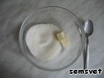 | Положить в посуду для замеса 1 ст. л. сливочного масла и 3/4 ст. сахарного песка (1/4 стакана оставьте на потом). Посуду лучше брать побольше, так как тесто на промежуточном этапе сильно увеличится в размерах!