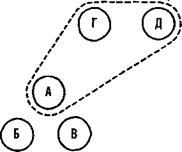 Рис. 8 каждую текущую ситуацию, следуя мимолетным ощущениям и потребностям. Концепции существуют только в голове. Если, посмотрев на рисунок 8, вы решаете объединить в одну группу предметы А, Г и Д, значит, у вас есть какой-то внутренний резон для такого выбора. С объективной точки зрения в одну группу следует объединить предметы А, Б и В, потому что они близко расположены по отношению друг к другу. Такие концепции, как нравственность, справедливость и красота, существуют только в голове. Платон это прекрасно понимал, однако хотел придать данным понятиям объективность материального мира. Поэтому он придумал такое понятие, как «идеальные формы», которые всегда присутствуют в сознании, но являются при этом истинными, универсальными и неизменными. Платон признавал огромную важность восприятия, но хотел убежать от субъективности и изменчивости этого мира. Важнейшее место во внутреннем мире занимают убеждения. Они представляют собой переход от возможности к «истине» внутреннего мира. В отличие от «возможности», которую допускаешь, убеждение — это то, в чем ты совершенно уверен. Убеждение — это истина внутреннего мира. Вы можете верить, что, упав с четвертого этажа, вы непременно разобьетесь насмерть, даже если никогда не пробовали сделать это. Вы можете верить, что вода заражена бациллами холеры, потому что люди, которые ее пили, заболели холерой. Убеждение — это представление, побуждающее нас воспринимать мир таким образом, чтобы это восприятие оправдывалось. Если вы считаете какого-то человека негодяем, вы замечаете в его поведении только те черты, которые подтверждают вашу убежденность. Если вы считаете кого-то эгоистом, вы замечаете в его поведении только те аспекты, которые превращают ваше мнение в твердое убеждение. Мировоззрение Платона само по себе было системой убеждений. Он верил, что в мире существуют высшие истины, как это имеет место в математике. Сократ говорил, что если не удается найти истину, то это лишь свидетельство невежества. Невежество подтверждает, что истина есть, но не может быть найдена. Система убеждений является хорошим примером того, что информация способна самоорганизовывать- ся в мозгу. Система убеждений образует замкнутый круг, который трудно разорвать. Сформировавшись, она более не нуждается в поддержке со стороны внешнего мира. Какая бы информация ни поступала извне, она структурируется восприятием так, чтобы убеждения лишь подтверждались. Ключевой операцией в восприятии является «поток». Это означает, что одно событие вытекает из другого. Данный аспект подробно описан в моей книге «Водная логика». Там я ввожу понятие потокограммы, которая является попыткой наглядно показать человеку, что может происходить в его восприятии. Из потокограммы вы можете выбрать то, что я называю «точками стока», «узловыми точками» и «замкнутыми истинами». Вероятно, всякая перцептивная истина является «замкнутой». На рисунке 9 мы видим, как из А следует Б, из Б — В, В ведет к Г, Г к Д, Д к Е, а из Е вытекает Г. Наконец, установился замкнутый круг. Трудно представить, каким образом перцептивная истина могла бы иметь иную форму, нежели форма замкнутого круга. Чтобы объяснить некую ситуацию, мы переходим от нее к гипотезе, которую затем прокручиваем в голове в поиске результата, отвечающего первоначальной ситуации. В науке 