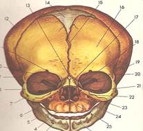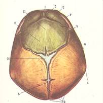 Имеется ряд особенностей в строении черепа ребенка. У новорожденного легко прощупываются швы между костями. Между теменными и лобной костями имеется участок, лишенный костной ткани, затянутый соединительнотканной перепонкой. Это так называемый большой (передний) родничок. Он имеет ромбовидную форму и размер в поперечнике примерно 2 — 2,5 см. Большой родничок обычно закрывается к 12—15 мес. жизни. Между теменными и затылочной костями расположен так называемый малый (задний) родничок, имеющий треугольную форму. Он открыт при рождении приблизительно у 25% новорожденных, закрывается к 3 мес. жизни. Позвоночник новорожденного, состоящий в основном из хрящей, почти прямой, не имеет искривлений. Позже появляются физиологические искривления по длине позвоночника: в 2-месячном возрасте — шейный лордоз (ребенок начинает держать голову), к 6 мес. — грудное искривление позвоночника кзади (ребенок сидит), к 1 году — характерный поясничный лордоз (ребенок начинает ходить). Типичная конфигурация позвоночника устанавливается примерно к 3—4 годам. В связи с особенностями строения позвоночника ребенка неблагоприятные условия воспитания, ухода могут привести к проблеме искривления позвоночника в виде сколиоза (боковое искривление) и кифоза (дугообразное искривление кзади). Это необходимо помнить при организации ухода и режима в детских учреждениях и дома.