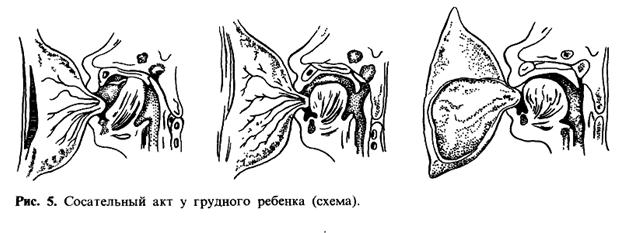 Пищеварительный аппарат у детей отличается рядом анатомо-физиологи-ческих особенностей, которые в значительной мере отражаются на его функциональной способности и наиболее выражены в раннем детском возрасте. В этом периоде пищеварительный аппарат по своим функциональным возможностям приспособлен лишь для усвоения грудного молока. Новорожденный имеет хорошо выраженные сосательный и глотательный рефлексы. Если ребенок здоров, через 6—12 ч после рождения его можно приложить к груди матери. Акту сосания содействуют особые ва-ликообразные утолщения во рту — альвеолярные возвышения, расположенные на альвеолярных отростках, поперечная исчерченность на слизистой оболочке губ, а также жировые комочки в толще щеки (комочки Биша). Самый акт сосания состоит из трех фаз (рис. 5): аспирации (а), сдавливания соска (б) и проглатывания аспирированного молока (в). Приложенный к груди матери ребенок плотно охватывает губами сосок и часть околососкового кружка, сообщение между полостью рта и наружным воздухом прекращается. Язык ребенка прижимается к небу, нижняя челюсть опускается, во рту создается отрицательное давление. В разреженное пространство полости рта поступает грудное молоко, которое ребенок проглатывает. Полость рта у ребенка относительно мала, слизистая оболочка нежная, богата кровеносными сосудами. Язык широкий и короткий, хорошо развита жевательная мускулатура. В первые месяцы жизни слюнные железы функционируют недостаточно, выделяют лишь незначительное количество слюны. Обилие кровеносных сосудов и сухость слизистой оболочки полости рта способствуют ее легкой ранимости. С 4-го месяца слюноотделение значительно усиливается. Из полости рта пища поступает в пищевод. Он относительно длиннее, чем у взрослых: у новорожденного — 10 — 11 см, у детей грудного возраста — 12 см. Слизистая оболочка пищевода нежна, богата сосудами. Секреторные железы отсутствуют, мышечный слой развит недостаточно.