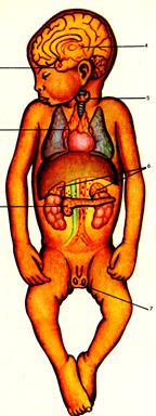 Гормоны передней доли гипофиза: 1) соматотропный гормон (СТГ), или гормон роста, стимулирующий развитие и рост всех органов и тканей тела; 2) тиреотропный гормон (ТТГ), влияющий на функцию щитовидной железы; 3) адренокортикотропный гормон (АКТГ), регулирующий углеводный обмен вследствие действия на надпочечники; 4) пролактин (лютеотропный гормон -ЛТП; 5) лютеинизирующий гормон (ЛГ); 6) фолликулостимулирующий гормон (ФСГ). Последние три вида гормонов, называемые гонадотропными. влияют на созревание гонад, стимулируют биосинтез половых гормонов. Средняя доля гипофиза выделяет меланощитостимулирующий (мелано-формный) гормон (МФГ), стимулирующий образование пигмента в коже. Гормоны задней доли гипофиза: антидиуретический гормон (вазопрессин), ок-ситоцин — влияют на уровень артериального давления, половое развитие, диурез, белковый и жировой обмен. Нарушение функции гипофиза может привести к развитию ряда заболеваний: акромегалия, гигантизм, болезнь Ку-шинга (Иценко — Кушинга), гипофизарная карликовость (нанизм) — карликовый рост, несахарный диабет и др. Щитовидная железа является одним из важнейших органов внутренней секреции. Состоит из двух долей и перешейка, располагается впереди и по обеим сторонам трахеи и гортани. К моменту рождения имеет незаконченное строение. Гормоны, выделяемые железой, — тироксин и трийодтиро-нин. Эти гормоны влияют на нервную систему, кровообращение, процессы роста и развития, течение инфекционных и аллергических процессов. Щитовидная железа синтезирует также кальцитонин (тиреокальцитонин), регулирующий нормальный уровень кальция в крови и отложение его в костной ткани. Нарушение функции щитовидной железы приводит к гипотиреозу, гипертиреозу, эндемическому зобу. Функция щитовидной железы усиливается к 5 —6 мес, максимальное действие гормоны оказывают в 5 лет. В препубер-татном возрасте (12—15 лет) масса и размеры железы значительно увеличиваются. Паращитовидная (околощитовидная) железа - очень маленькая по размеру, имеет форму овального тельца, чаще всего в виде двух пар располагаются на задней поверхности щитовидной железы. Она выделяет паратгормон (паратиреоидный гормон), играющий важную роль в регуляции обмена кальция. При нарушении функции паращитовидной железы развивается гипопаратиреоз или гиперпаратиреоз. Вилочковая (зобная) железа — парный дольчатый орган, расположен в верхнем отделе переднего средостения. В эмбриологическом аспекте ви-лочковая железа — один из первых органов внутренней секреции и первый лимфоидный орган. Выделяют 4 периода развития вил очковой железы: 1) до 1-го года жизни железа сохраняет эмбриональные черты строения; 2) в старшем ясельном возрасте (от 1 года до 3 лет) намечается процесс дифференцировки железы; 3) в возрасте от 3 до 8 лет заметно увеличиваются размеры телец вилочковой железы (телец Гассаля), а также соединительной ткани; 4) в пубертатном (подростковом) возрасте идет процесс обратного развития железы. По современным представлениям вилочковая железа является первичным регулятором иммунных процессов в организме. Однако более детально функция вилочковой железы пока еще недостаточно изучена, как и взаимосвязь ее с другими органами и системами. Надпочечник — парная железа внутренней секреции, расположенная в забрюшинном пространстве над верхним полюсом п