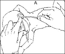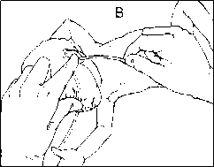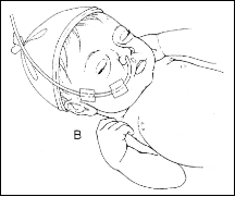 7.4.6. В случае, когда ребенок кашляет или срыгивает| во время кормления, предлагают матери кормить некоторое время в вертикальной позиции (рис. 3 А и В): мать поддерживает грудную железу и подбородок ребенка рукой, задняя стенка шеи и горло ребенка должны находиться выше соска.