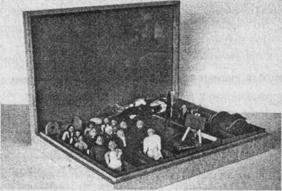 2. Конструктивные. Предлагаются оформленные детали (фигурки людей и животных, модели их жилищ и пр.), из которых нужно создать осмысленное целое и объяснить его. Сценотест (рис. 6.2), например, состоит из миниатюрных человеческих фигур, фигурок животных, деревьев и предметов повседневной жизни. Испы туемые, обычно дети и подростки, создают разные сцены из своей жизни (или заданные им экспериментатором), а по определенным особенностям этих сцен и рассказа о них делаются выводы как о личности их создателя, так и о специфике социального окружения.