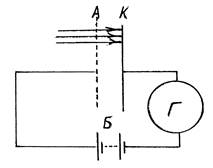 Введение Воздействие света на вещество состоит в сообщении веществу энергии, приносимой световой волной. Одним из проявлений воздействия света на вещество является внешний фотоэффект— испускание электронов веществом под действием света. Явление фотоэффекта было открыто Герцем в 1887 г., а затем подробно изучено А. Г. Столетовым (1888 г.). Схема опыта А. Г. Столетова представлена на рис. 1. Поток света падает на конденсатор, состоящий из двух пластин. Одна представляет собой металлическую сетку (А), через которую свет может свободно попадать на вторую пластину, являющуюся катодом (К). Б — батарея, с помощью которой создается поле между пластинами конденсатора. А. Г. Столетов установил, что при освещении светом от электрической дуги пластина К теряет свой заряд; при этом гальванометр Г показывает наличие тока. Позднее было установлено, что пластина К. испускает электроны. Используемая в опытах Столетова схема представляет собой простейший фотоэлемент с внешним фотоэффектом. Пластина К носит название фотокатода, а пластина А — фотоанода. Испускаемые фотокатодом электроны называют фотоэлектронами, а возникающий электрический ток — фототоком.