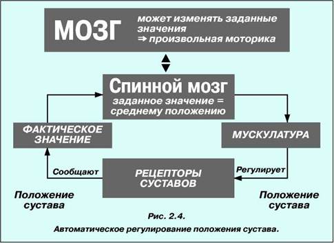 соединяться друг с другом: сгибание — разгибание, отведение — приведение, вращение внутрь и наружу. Если бы мы двигались только в представляемых нами плоскостях, то наши движения выглядели бы угловатыми, как у робота. Красивое экономное движение всегда соединяет в себе все три плоскости, оно плавное и закругленное. Таким образом, движение должно совершаться в трехмерном пространстве. К счастью, для четвертого измерения еще не придумана модель, которую можно представить себе мыс ленно. Что происходит в самом суставе в момент движения? Как вы видите на рис. 2.3, одна часть сустава вращается относительно другой. При этом на одной стороне возникает растяжение, а на противоположной — сжатие. В среднем положении сустава суставная сумка наименее напряжена, и внутреннее давление в суставе минимально. Нервы оценивают это как нормальный показатель. Та кое положение наиболее благоприятно и для диффузии. Если же внутрисуставное давление слишком высоко, питательные вещества не могут больше диффундировать. Если такое состояние продолжается долго, это отрицательно сказывается на хряще, а тем самым и на самом суставе. Рецепторы суставной сумки сразу сигнализируют об отклонении от среднего положения для того, чтобы мышцы автоматически отреагировали на это и вернули сустав в нормальное состояние (рис.2.4). Вот почему и сами мышцы наименее наряжены именно при среднем положении сустава.