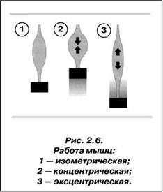 Чтобы наглядно представить себе три основных типа работы мышц (рис.2.6), возьмите в руку тяжелый предмет и держите его перед собой, согнув локоть примерно под прямым углом. Работу по удержанию при этом должна осуществлять плечевая мышца сгибатель. Это принято называть изометрическим сокращением, мышца работает, не сокращаясь. Теперь поднимите предмет, сгибая руку в локте еще больше. Мышца сгибатель плеча при этом сокращается, обеспечивая некое перемещение, она работает концентрически. Если же мед ленно опустить руку, то мышца сгибатель (не разгибатель!) плеча все еще будет работать, но в этом случае она будет растягиваться. Это эксцентрическое сокращение самое трудное, оно чаще все го приводит к появлению боли в мышцах. Такая форма мышечной работы наиболее важна для сохранности суставов. Заметьте: не сокращение, а медленное, контролируемое расслабление, уступка сопротивлению (весу, силе тяжести) является для мышцы самой важной работой. Именно это лучший способ тренировки мускулатуры. Мышца обеспечена очень хорошим кровоснабжением, так как для работы ей в больших количествах необходим кисло род. При продолжительном напряжении повышенное давление в ней препятствует кровоснабжению. К отдельным волок нам перестают поступать питательные вещества. Если запас кислорода истощается, то мышца больше не может нормально выполнять свою работу. К тому же прекращается отвод молочной кислоты — продукта распада, образующегося в процессе обмена веществ в мышце. Кис лота вызывает в ней боль, из-за чего она начинает часто и судорожно сокращаться, вследствие чего снабжается кровью