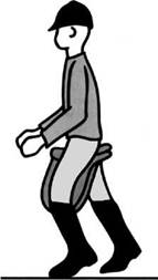 Рис. 3.11. Положения таза: а — опрокинутый вперед; б — в средней позиции; в — опрокинутый назад. значение. То же самое можно сказать и о верховой езде. Даже высокий и грузный всадник может показаться лошади более легким, чем раскачивающийся и разболтанно сидящий в седле легкий всадник в «весе мухи». Всегда надо помнить, что вес всадника может вывести лошадь из состояния естественного равновесия. И другой важный момент: чем спокойнее, увереннее ваша посадка, тем быстрее лошадь отреагирует на ее изменение. Однако хватит теории, вы уже сели в седло, и ваша лошадь спокойным шагом с захватом пространства двинулась по манежу. Для начала сосредоточьте внимание на местах соприкосновения с седлом, т.е. на седалищных костях и «на разрезе». При оптимально подогнанном седле верхний край лобковой кости может дополнительно опираться еще и на переднюю луку седла. Чтобы добиться глубокой по садки и полного слияния с лошадью, представьте себе, что вы как бы отстегиваете свои собственные ноги, а вместо них пристегиваете четыре лошадиных. Девизом здесь будет не активное движение, а подчинение движению. Шаг При езде шагом можно почувствовать, как лошадь ступает под вами. Шаг лошади передает спине всадника движение, подобное человеческому шагу — некий образ походки, поступи. Открытие этого факта объясняет некоторые поразительные результаты лечебной верховой езды. Лошадь, идущая шагом, может передавать пациенту инвалиду некий образ человеческой ходьбы. Если сосредоточить внимание на собственных седалищных костях, то можно почувствовать, как лошадь, отталкиваясь соответствующей задней ногой, двигает вас вперед. Это такое ощущение, как будто бы вы идете на собственных седалищных костях. Часто езду шагом неверно понимают как некое движение, которое проявляется в раскачивании или же в отрывистых движениях таза и корпуса. Напомню вам сравнение с плохо упакованным рюкзаком — поберегите спину вашей лошади. Рысь При езде рысью спина лошади поднимается и опускается более равномерно. Теперь представьте себе, что ваши седалищные кости являются как бы массирующей рукой. При хорошем массаже рука массажиста всегда находится в контакте с телом, она никогда не теряет его полностью, хотя характер нажима, его интенсивность могут меняться. Седалищные кости распределяют по сторонам на грузку на мышцы спины лошади. По сути, колеблющаяся спина лошади как бы массирует сама себя. Галоп В случае галопа представьте себе снова, что ваши седалищные кости являются вашими ногами, и вы делаете с их помощью как бы подскок (рис. 3.12). При этом внутренняя часть бедра совершенно автоматически выходит вперед и подвергается большей нагрузке в точном соответствии тому, как этого требует учение о верховой езде. Такая картинка часто помогает, когда на галопе всадники привстают в седле. Важный момент — вы не сами делаете такой прыжок, а поддаетесь движению лошади, которая заставляет вас двигать тазом так, как если бы вы делали такой прыжок сами. Лишь став частью движения лошади, вы сможете пробовать влиять на него,