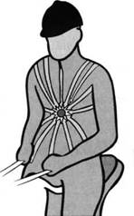 Две противоположные мышечные цепочки проходят по телу и встречаются в одном суставе. В этом месте находится критическая точка: этот сустав больше не может амортизировать движение в одном из направлений, и цепочки прерываются. В вышеописанном случае такой критической точкой чаще всего является плечо или шейный отдел позвоночника. Таким образом, при верховой езде многие мелочи играют очень большую роль. А, как известно, в деле всякая мелочь может пригодиться. Еще одна тонкость: разбор поводьев, сильно влияющий на характер верховой езды. Лучше всего возьмите один повод в руки и попробуйте сделать следующее: если вы зажмете повод в кулаке, то сустав кисти станет как каменный и тогда такая задача, как амортизация в нем движения, превратится в далекую и неисполнимую мечту. Повод следует держать между большим и указательным пальцем. Благодаря этому другие пальцы могут свободно взаимодействовать со ртом лошади, так как им не надо будет держать повод. В учебнике верховой езды по этому поводу написано: «Большой палец должен лежать на поводе подобно крыше» (рис. 5.19). Откровенно говоря, я знаю очень мало всадников, которые обращают на это внимание. Однако постарайтесь понять разницу. Сожмите свою руку в кулак, так чтобы большой палец плашмя лежал сверху. Попробуйте теперь подвигать лучезапястный сустав в разных направлениях, и вы почувствуете, насколько он зажат. А теперь поменяйте положение большого пальца и прижмите его с такой же силой к указательному пальцу, — вы почувствуете, что ваш лучезапястный сустав уже может двигаться гораздо свободнее. Когда большой палец лежит плашмя, то мышца зажимает весь лучезапястный сустав. Вот еще одна «мелочь», имеющая серьезное последствие. В главе о верхней части корпуса я предложила вам несколько упражнений, способствующих улучшению подвижности позвоночника. В принципе, они являются хорошей подготовкой для развития