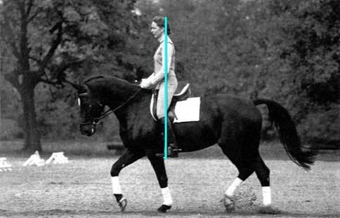 Рис. 7.3. Правильная строевая рысь с линией нагрузки. держаться более вертикально). На строевой рыси особенно важна длина бедер. Длинное бедро требует большего наклона вперед, чем относительно короткое бедро. Только после того, как верхняя часть корпуса всадника будет сохранять равновесие над изменяющейся площадью опоры, руки смогут обрести независимый от привставания и опускания в седло равномерный контакт со ртом лошади. Понаблюдайте за разными всадниками, когда они едут строевой рысью. Довольно распространенной является такая привычка — привставая и опускаясь в седло, соответственно поднимать или опускать руки. В этом случае можно хорошо поупражняться, придерживаясь за ремешок впереди седла. На строевой рыси он не должен колебаться ни вперед назад, ни вверх вниз, надо суметь добиться его равномерного натяжения на каждой фазе строевой рыси в любом из желаемых направлений (например, впереди вверх). Ноги всадника на строевой рыси не должны судорожно сжимать бока лошади и быть выпрямленными в стороны. Как привычка вставать на стременах, так и попытки, слишком выпрямляя колени, привставать в седле как можно выше, слишком сильно выпрямляя колени, препятствуют тонкой игре балансирования над разными площадями опоры (рис. 7.4). Бывает действительно трудно уяснить себе, что при привставания в седле площадь опоры опускается ниже, а при опускании в седло, хотя ноги оказываются ниже,
