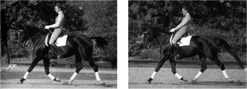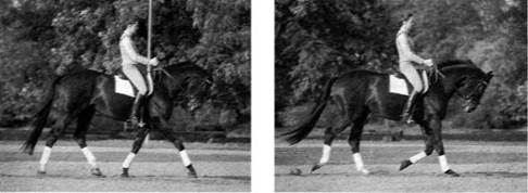 Рис. 7.14. Попытка распрямить лошадь рукой заканчивается тем, что лошадь идет на переду. Тончайшая форма полуодержки присутствует непосредственно в движении. Подаваемая сзади «на руку» всадника лошадь упирается в трензель, и цепочка реакции возвращается назад, побуждая заднюю ногу сильнее заступать под центр тяжести и принимать на себя больший вес (рис. 7.15). Собственно говоря, именно это выдерживающее действие повода лошадь использует для себя. Тот, кто четко почувствовал это хотя бы в течение нескольких мгновений, знает, что значит ездить верхом. В понятие полуодержки наряду с постоянным контролем за сохранением и улучшением качества движения входят также разница в темпе и переходы от одного аллюра к другому. О переходах движения рысь—галоп и шаг—рысь я хотела бы рассказать более подробно. Прежде всего, такие качества, как гибкость и ловкость лошади тренируют на сменах рыси и галопа. Лошадь должна двигаться с импульсом, меняя при этом движение в два темпа на движение в три темпа и изменять последовательность касания грунта ногами, не теряя при этом импульса в поступательном движении вперед. Все это гармонично удается лишь в том случае, когда лошадь адекватно реагирует на применение посылающих и сдерживающих средств управления, а сам всадник находится в равновесии. Лошади довольно часто уклоняются от требуемого растяжения мускулатуры (которое я описала с ключевым понятием резиновой ленты), выдергивая затылок при подъеме в галоп, поднимая круп при одержке, опуская перед, замедляя темп движения вплоть до перехода в шаг (потеря импульса!) или резко вырываясь вперед. В этом случае необходима компетентная езда, чтобы четко согласовать воздействие уклонами корпуса всадника и других средств управления, чтобы на этих переходах лошадь двигалась гибко, не теряя импульса. Это упражнение пре доставляет также хорошую возможность для проверки восприимчивости лошади. В основе своей оно служит для расслабления и улучшения гибкости и ловкости, как всадника, так и лошади. При этом всадник учится менять параллельную загрузку основания посадки на диагональную — и наоборот. На таких переходах движения отчетливо проявляется тенденция отставать или опережать корпусом движение лошади. При подъеме в галоп всадники любят немного привставать в седле, а при одержке заваливаться назад. Постоянное сохранение своего собственного центра тяжести в поступательном движении вперед и способность одновременно оставаться самому над центром тяжести лошади — очень сложная и скрупулезная задача. Многим всадникам для ее выполнения помогает полная концентрация на положении седалищных бугров; это означает, что в конце темпа на галопе они глубоко «врастают» в лошадь, затем равномерно распределяют свой вес на оба седалищных бугра и спокойно сидят на рыси. Про сто удивительно, как лошади при минимальном воздействии повода и реагируя только на изменения в посадке всадника, могут набирать и сокращать темп. В основных чертах переход с рыси на шаг и снова на рысь можно сравнить с переходом рысь—галоп. Единственное отличие заключается в том, что совершается переход от импульсивного аллюра рыси к относительно лишенному импульса аллюру шагу. Следовательно, импульс не остается неизменным, как при переходе рысь—галоп, а его нужно затормозить и развить заново.