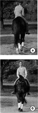 Когда всадник сгибает корпус в талии, все происходит совершенно иначе (рис. 8.20 д, е). В этом случае отклонение движения в сторону происходит непосредственно в позвоночнике, а именно на стыке поясничного и грудного отделов. В большинстве случаев корпус отклоняется в сторону при выполнении заездов, боковых движений (принимания), сгибаний, подъемов в галоп, т.е. в те моменты, когда верхняя часть корпуса должна сопровождать перемену направления движения и от всадника требуется гибкая посадка в повороте. Сгибание корпуса в талии представляет собой «элегантную» возможность уклониться от этой гибкой посадки. Область перехода поясничного отдела позвоночника в грудной отдел является местом точного переключения основного направления движения — наклон в сторону