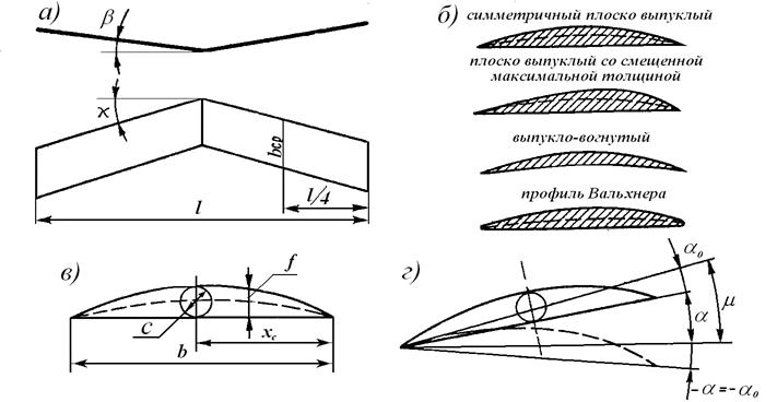 Рис. 2.2. Геометрические характеристики крыла: а — элементы формы крыла; б — типы профилей; в — элементы профиля; г — углы атаки.