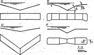 Рис. 3.1. Форма малопогруженных крыльев повышенной мореходности: а — килеватое прямое; б — килеватое со стреловидностью; в — сложно-килеватое (с переменной килеватостью); прямое с уширенными концами; г —плоское с заглубленной средней частью (крыло «чайка»). Килеватость малопогруженного крыла (рис. 3.1, а) также увеличивает его мореходные качества. Средняя часть крыла оказывается более заглубленной и в меньшей степени подвергается воздействию свободной волновой поверхности. Сочетание килеватости и стреловидности (рис 3.1, б) позволяет получить крылья повышенной мореходности при встречном волнении. Но такие крылья, как показал опыт, в условиях движения на попутном волнении уступают килеватым прямым крыльям, выполненным по схеме рис. 3.1 в. Так же следует иметь в виду, что на поведение крыла при волнении влияет не только волновая форма свободной поверхности, но и орбитальные скорости движения частиц воды, которые изменяют направление набегающего на крыло потока, т.е. угол атаки, что приводит к увеличению или уменьшению подъемной силы в зависимости от места положения крыла по фазе волны и направления движения судна относительно волн. В отдельных случаях влияние орбитальных скоростей может привести к срыву крыльевого режима (выскакивание крыла из воды или его провал). Мореходность СПК на малопогруженных крыльях возрастает с увеличением абсолютных размеров судна, но в принципе применение этих крыльев в морских условиях возможно лишь для судов прибрежного плавания. Date: 2015-05-19; view: 873; Нарушение авторских прав |