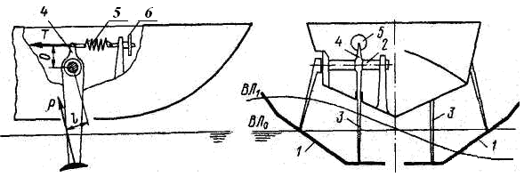 ступает сигнал на дальнейшее уменьшение подъемной силы, то клапан А открывается полностью, а затем открывается и клапан Б, пропуская атмосферный воздух и к переднему ряду отверстий. При сигналах датчиков на увеличение подъемной силы закрываются сначала клапан Б, а затем и клапан А. При полностью закрытых клапанах А и Б достигается максимальная подъемная сила (больше расчетной) теперь уже невентилируемого крыла. В состав пневмосистемы всего вентилирующего устройства входят воздушные трубы 4, через которые воздух подводится «самотеком» к нагнетательной стороне крыла в случае, если давление на ней становится ниже атмосферного. Для регулирования подачи воздуха в пневмомеханической САУПК используются достаточно надежные и простые датчики: маятник, гироскопы (чувствительные к угловой скорости), манометры статического давления, приборы для определения глубины погружения крыла и др. Система воздушной стабилизации движения является весьма чувствительной и быстродействующей, так что она реагирует даже на короткие небольшие волны. По сравнению с механизированными крыльями с электронной САУПК вентилируемые крылья имеют следующие преимущества: крылья не имеют подвижных частей (закрылков) и, следовательно, являются более простыми по конструкции и надежными в эксплуатации; блок датчиков управления состоит из более простых и надежных приборов; малые усилия на передвижку золотников и клапанов воздушной системы позволяют обходиться без мощных гидроприводов; на вентилируемых крыльях можно получить заметно большие скорости движения СПК в докавитационном режиме; система в целом более простая, надежная, намного дешевле электронной и не требует особой квалификации экипажа судна, К недостаткам вентилируемых крыльев относятся следующие: повышенное сопротивление крыла (примерно на 5—6%), в результате чего скорость СПК с вентилируемыми крыльями на тихой воде меньше по сравнению со скоростью однотипных судов, оборудованных обычными крыльями. Однако в условиях волнения благодаря уменьшению размахов качки и замывания корпуса СПК с вентилируемыми крыльями развивают большую скорость; увеличенная площадь вентилируемого крыла на 1 т создаваемой подъемной силы по сравнению с обычными погруженными крыльями. В настоящее время благодаря своим преимуществам вентилируемые, крылья получают распространение. В дополнение к вышерассмотренному основному признаку классификации подводных крыльев, по которому они разделены на различные конструктивные типы в зависимости от способа регулирования (стабилизации) подъемной силы, можно назвать еще несколько признаков их классификации. По способу крепления к корпусу судна подводные крылья разделяют на две группы: неподвижные или жестко скрепленные с корпусом крылья. Это обычный, наиболее распространенный тип крыльев; подвижные или убирающиеся крылья, которые крепятся с корпусом шарнирно (поворачивающиеся, откидные) или по какой-то другой подвижной схеме крепления так, что могут убираться из воды (или прижиматься к корпусу). Это бывает необходимо в целях уменьшения габаритной осадки судна при подходе к пирсу или же для обеспечения движения судна в водоизмещающем режиме, когда движение на крыльях невозможно (мелководье, сильное волнение, аварийное состояние крыльев). По количеству крыльевых